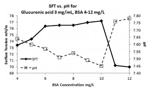 圖 6. 改變 BSA 蛋白的溶液中糖醛酸(葡萄糖醛酸)濃度為 3 mg/L 時的 SFT(菱形)和 pH(空心方塊) 濃度。 CMC,臨界膠束濃度,在 BSA 濃度為 10 mg/L + 3 mg/L 葡萄糖醛酸。 pH 值變化約 0.3 個單位 SFT 范圍為 7 mN/m。