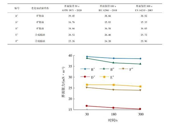 IEC62961:2018方法介于ASTMD971方法和EN14210方法之間,在界面形成180s時測量界面張力更加符合實際,同時測量時間對測量結果影響較小。從圖3和圖4也可以看出,老化油的界面張力隨時間變化較為明顯,主要表現在界面張力曲線從30s到180s的變化斜率較大,而在界面形成的180s時測量界面張力數值與300s的測量數據很接近,可以提供一個較為真實的界面張力值,并且檢測時間相對較短。