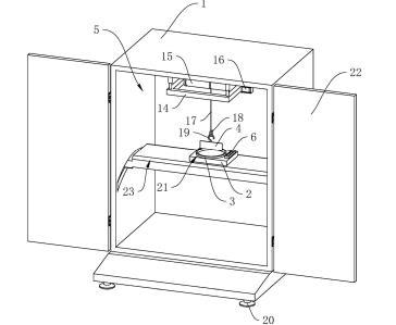 參照圖1,包括殼體1、工作臺2、盛液盒3和標準板4,殼體1內設置有工作腔5,殼體1底部設置有多個支撐腳20,在本申請實施例中,支撐腳20設置為四個,四個支撐腳20設置于殼體1的四角位置;殼體1上鉸接有兩轉動門22;工作臺2設置于工作腔5內,工作臺2上開設有與盛液盒3適配的放置槽21,盛液盒3可放置于放置槽21中,標準板4設置于盛液盒3上方,標準板4通過升降結構可升降連接于殼體1上,工作臺2上固定連接有水平儀6,在本申請實施例中水平儀6選用氣泡式水平儀,也可選擇其他體積較小的水平儀;工作臺2和殼體1之間設置有用于調平工作臺2的調平結構。