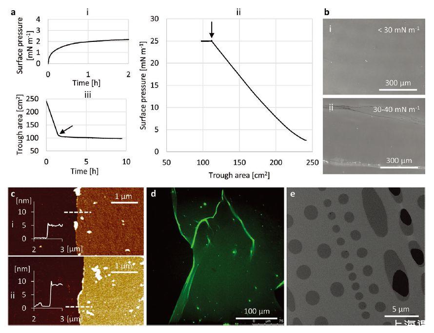 圖2、a)在空氣-水界面處的FhuA膜并轉移到基底上。(i)吸附,(ii)壓縮,和(iii)在膜制造期間從0.32nmol FhuA WT涂布在磷酸鹽緩沖液頂部測量的谷面積-時間曲線在(ii)和(iii)中,戊二醛的注射用箭頭標記。B)相應的BAM成像顯示(i)在高達30 mN/m的表面壓力下均質的FhuA膜-1.(ii)表面壓力超逾30mN/m)(i)一個或(ii)兩個FhuA膜片的AFM圖像,所述膜片層疊在硅基底的頂部上(左半部分用注射器尖端刮去)。高度分布屬于圖像中的虛線,并且指示(i)5和(ii)9 nm的膜厚度。d)單個FhuAΔCVF的共聚焦熒光顯微鏡圖像,用熒光標記物標記的硅襯底上的薄膜片e)獨立地覆蓋TEM網格(淺灰色)的結構化碳膜中的孔(深灰色)的FhuA WT膜的HIM圖像。黑色區(qū)域顯示膜中的缺陷。