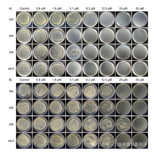 圖1、用于確定(A)大腸桿菌和(B)金黃色葡萄球菌中肽的最低殺菌濃度(MBC)值的細菌培養物。
