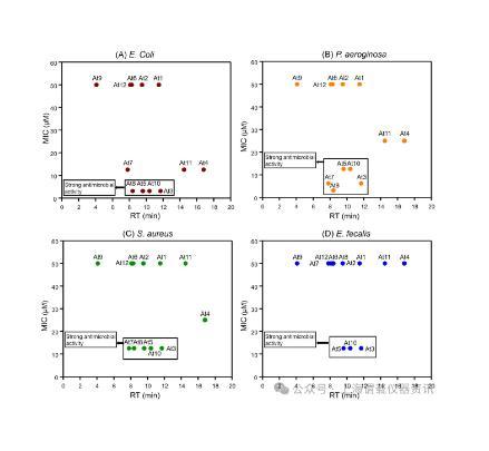 圖3、設計的抗菌肽的疏水性由它們的HPLC保留時間確定,與它們對不同菌株(A)大腸桿菌、(B)銅綠假單胞菌、(C)金黃色葡萄球菌和(D)大腸桿菌的抗菌活性之間的關系。