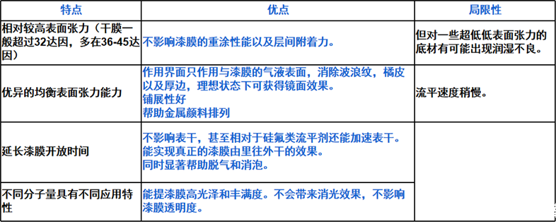 常見的丙烯酸酯類和聚酯類流平劑的一些典型應(yīng)用特性: