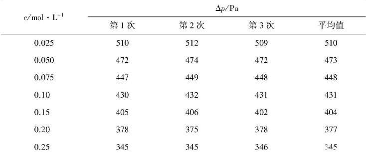 ⑥按照上述方法測定不同濃度正丁醇溶液的Δpmax值。不同溶液測定時須按低濃度到高濃度的次序測定;測定每一樣品時只需要用同樣濃度的溶液淌洗3次即可,并對測量數(shù)據(jù)進行記錄(例見表1)。