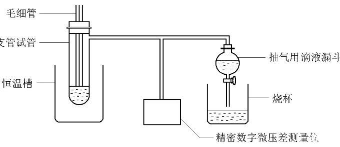 儀器:AF-02型數(shù)字式微壓測量儀,數(shù)控恒溫槽,5mL和10mL移液管各一支,堿式滴定管1支,50mL容量瓶9個,樣品管1個,毛細管1個,抽氣瓶1個,錐形瓶1個,玻璃漏斗1個。