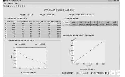 借助MATLAB工程計算平臺,通過程序設計完成了“正丁醇水溶液表面張力的測定”應用軟件的開發(fā)。在完成錄入壓差實驗數(shù)據(jù)后,不僅可以自動計算和填入溶液的表面張力,還能夠實現(xiàn)溶液表面張力與濃度定量關系的希斯科夫斯基經(jīng)驗方程(Szyszkowski′s equation)中待估參數(shù)的求解,并用以求導供給吉布斯公式計算溶液的吸附量,進而推算溶液飽和吸附量和正丁醇分子的截面積。軟件的操作過程簡便、直觀、高效,避免了人工數(shù)據(jù)處理、繪圖的煩瑣和人為誤差,可提高實驗結果的準確性和重現(xiàn)性。