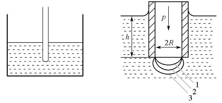由于最大氣泡壓力法的器材易得,且易于學生理解表面張力的原理,因而一直是教學中測定液體表面張力的一種常用方法[2]。如圖1所示,測定時將一根毛細管插入待測液體內部,從管中緩慢地通入惰性氣體對其內的液體施以壓力,使管端形成氣泡逸出。當所用的毛細管管徑較小時,可以假定所產(chǎn)生的氣泡是球面的一部分;但是在氣泡生成及發(fā)展過程中,氣泡的曲率半徑會隨惰性氣體的壓力變化而改變。當氣泡的形狀恰為半球形時,氣泡的曲率半徑最小(即毛細管半徑R),此時根據(jù)Laplace方程,管內外壓差達最大,其值Δpmax=p-ρgh可由差壓計測量得到[3]。利用最大壓差和毛細管半徑即可計算表面張力σ: