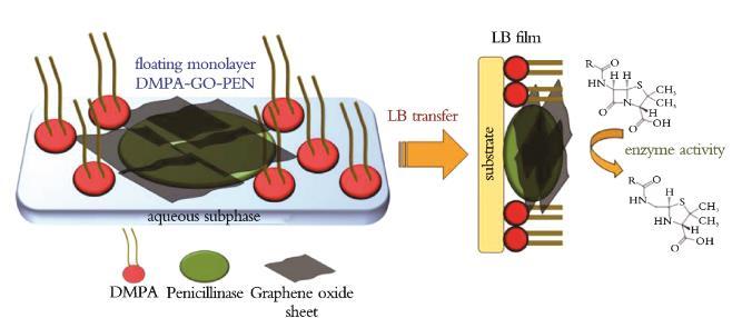 此外,將經典兩親分子的Langmuir單層與酶結合是保持生物大分子催化性能的一種方式。F.A.SCHLL等研究了磷脂LB膜固定化青霉素酶(PEN),將GO加入青霉素酶‐脂質Langmuir單層膜中,并作為LB膜轉移到固體載體上,評估了酶的催化性能(見圖3)。結果表明,GO作為由2,2‐二羥甲基丙酸(DMPA)和PEN組成的LB膜的添加劑,被固定在LB膜的PEN中;GO存在于酶脂LB膜中,不僅可以調節青霉素酶的催化活性,而且有助于數周后仍保持其酶活性。研究結果加強了混合納米結構薄膜的重要性,證明了使用由脂質、GO和酶組成的LB膜應用于光學生物傳感器的可行性,對應用傳感器的生物電子設備研究具有重要意義。