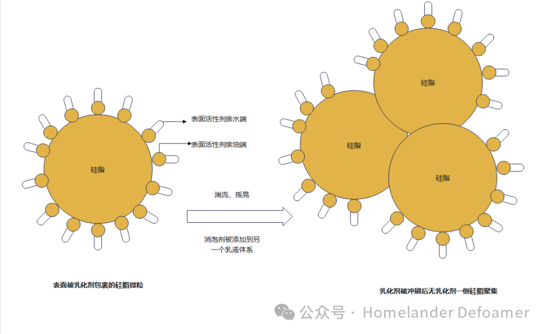 乳化劑既然很容易脫落,那么可以用化學鍵的方式,把乳化劑接枝在硅脂上,這樣即使析出,在沒有外加乳化劑和剪切力的情況下也能將析出的硅脂分散到體系中。這對親水基與親油基分子量的把控極其重要。若親水基太大,形成水包油的顆粒太小,雖然不析出。但是太小的微粒排液時間久,消泡速度就很慢。