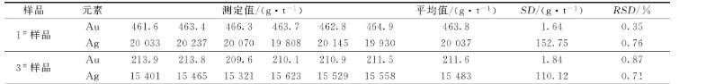 選取兩個粗鉍樣品,1#和3#樣品進行實驗,稱取2.000 g粗鉍樣品,按照以上實驗方法進行實驗,每個樣品做了6次平行實驗,結果如表7所示,金相對標準偏差(RSD)為0.35%~0.87%,銀相對標準偏差(RSD)為0.76%~0.71%。