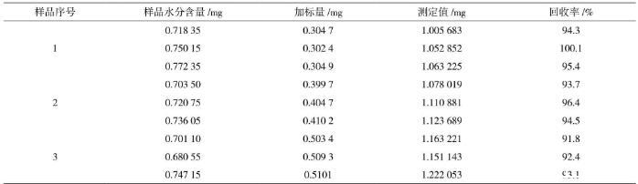 在樣品中加入精密稱取的標(biāo)準(zhǔn)水加標(biāo)水平分別為0.3 mg、0.4 mg、0.5 mg,在150℃加熱10 min的測定條件下,采用滴定度為1 mg/mL的費休氏試劑,每個加標(biāo)水平重復(fù)測定3次,經(jīng)測定,加標(biāo)回收率在91.8%~100.1%,結(jié)果見表6。