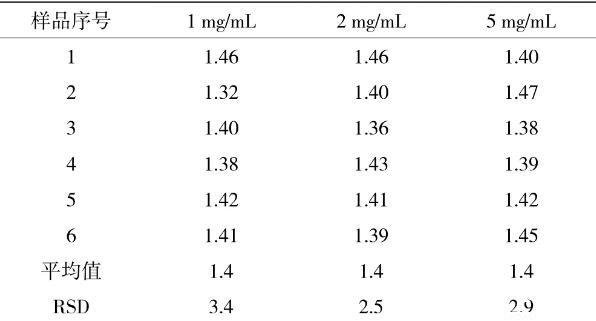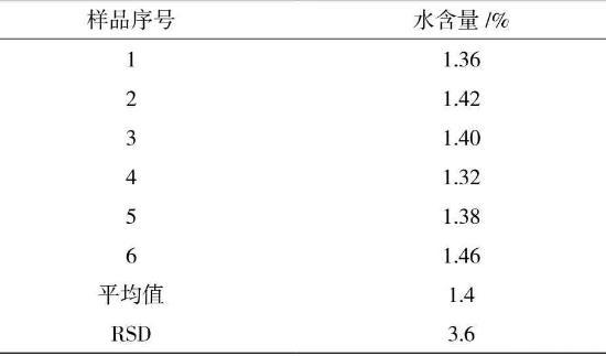 在150℃加熱10 min的測定條件下,采用滴定度為1 mg/mL的費休氏試劑,用卡氏干燥爐自動進樣法測定樣品中水分含量,樣品測定6次,計算6次結(jié)果的相對標(biāo)準(zhǔn)偏差(RSD%)數(shù)據(jù)見表5。結(jié)果表明測定結(jié)果具有良好的重復(fù)性。
