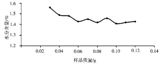 在150℃加熱10 min的測定條件下,樣品稱樣量也會對測定結(jié)果有影響[4]。分別稱取0.03g、0.04g、0.05g、0.06g、0.07g、0.08g、0.09 g、0.10g、0.11g、0.12g的樣品質(zhì)量,考察樣品稱樣量對測定結(jié)果的影響,結(jié)果見圖1。從圖中可以看出,儀器測得樣品水分含量隨著加入樣品質(zhì)量的增大逐漸趨于穩(wěn)定,當(dāng)單次加入的樣品質(zhì)量較小時,測得結(jié)果偏高[5]。稱量樣品質(zhì)量在50~120 mg結(jié)果無明顯差異。
