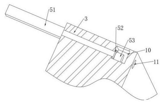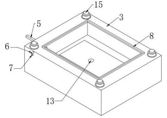 1、上模具;2、注塑口;3、下模具;4、收納槽;5、阻擋部;6、外接管;7、檢測器;8、修整片;9、放置槽;10、流動通道;11、通氣孔;12、熱流部;13、出料液壓桿;14、連接槽;15、電動伸縮桿;51、氣缸;52、密封圈;53、阻擋塊;121、熱流板;122、加熱絲;123、阻隔板。