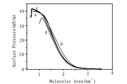 圖2為化合物1在純水和濃度為1×10-3mol/L的乙二酸,丙二酸,丁二酸亞相上的表面壓-分子面積等溫線。結果表明化合物1在純水和二元有機羧酸亞相均能很好的形成Langmuir膜,從π-A曲線觀察到化合物1在純水亞相時的崩潰壓為38 mN/m,在乙二酸,丙二酸,丁二酸水溶液亞相上的崩潰壓分別為41 mN/m,43 mN/m,35 mN/m.作固相段曲線的切線,外推至表面壓為零時,可求得化合物1在純水和二元有機羧酸亞相的平均單分子面積分別為1.9 nm2,2.4 nm2,2.2 nm2和2.1 nm2.崩潰壓的增加和單分子面積變大均表明化合物1與二元有機羧酸存在相互作用,形成了穩定的Langmuir膜。