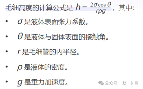 解答上述問題,可以從毛細高度的計算公式中找到答案。
