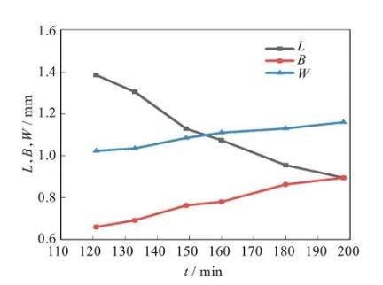 可以看出,從121 min開始,可以觀察到橢球形液滴已經初步形成,即從121 min開始計算橢球形液滴的三軸長度,根據實驗裝置圖,L和B為x和y方向的液滴長度,W為z方向的長度,根據公式W=R03/(LB)計算得到。