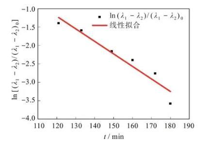 通過實驗可以得到L和B的時間演化,界面張力可以通過ln(λ1-λ2)/(λ1-λ2)0~t的斜率求得。通過軟件擬合出的形狀因子隨時間演化的圖形如圖5所示。利用式(1)~式(3)計算得到,PS/POE體系在230℃時系統的界面張力為0.397 mN/m。