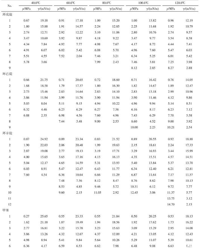 本文采用懸滴法測(cè)定了CO2-環(huán)戊烷/環(huán)己烷/環(huán)辛烷/甲苯/乙苯/乙基環(huán)己烷的界面張力,測(cè)量范圍為40~120℃,0.27~14.70 MPa。探討了壓力、溫度、碳原子數(shù)以及分子結(jié)構(gòu)對(duì)界面張力的影響并提出了計(jì)算CO2-原油組分界面張力的經(jīng)驗(yàn)方程。得出以下結(jié)論。