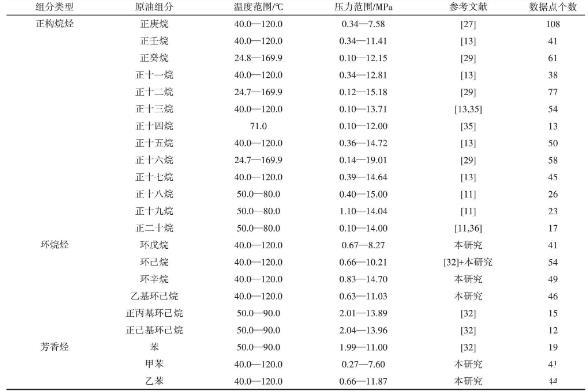 2.4.2實(shí)驗(yàn)數(shù)據(jù)回歸及模型參數(shù)的求取本研究系統(tǒng)收集了文獻(xiàn)數(shù)據(jù),并將研究測(cè)定的實(shí)驗(yàn)數(shù)據(jù),共計(jì)932個(gè)數(shù)據(jù)用于回歸,回歸所用數(shù)據(jù)見表2。回歸參數(shù)由最小二乘法得到,其目標(biāo)函數(shù)如式(9)所示。采用平均相對(duì)偏差(AARD)和均方根誤差(RMSE)表示計(jì)算效果,如式(10)、式(11)所示。回歸結(jié)果見表3。