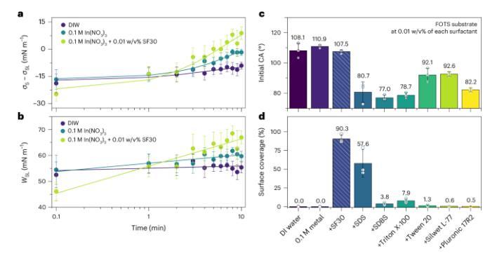 潤濕是液體在固體表面擴散以最小化自由能的現象,其效果通過界面張力和粘附功來定量評估。實驗顯示,添加SF30(煮沸30分鐘的絲蛋白)到水溶液中,盡管表面張力與對照組相似,但顯著降低了疏水性基底上的接觸角(CA),表明潤濕增強是由液固界面能的改變引起的,而非溶液表面能的變化(圖2a,b)。SF30通過多嵌段共聚物結構的多樣性有效調控界面能量,增強了潤濕效果,其水溶液在疏水性表面上的覆蓋率超過90%(圖2d)。與商用表面活性劑相比,SF30在控制疏水表面的潤濕性方面表現更優,即使這些表面活性劑能有效降低溶液的表面張力(圖2c)。
