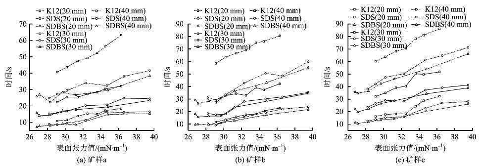 通過測定液面滲透到20,30,40 mm的時(shí)間,繪制3種礦塵反滲時(shí)間與表面張力的關(guān)系,如圖3所示。