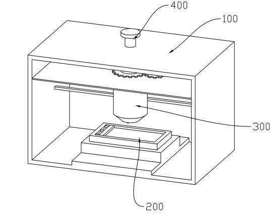 本實施例通過設置外殼100、涂片臺200和滴液機構300配合,在進行滴液操作時,使滴液筒310繞第一方向轉動,當滴液筒310轉動時,將促使副筒320和外筒330沿第一方向移動,且此時副筒320移動使滴液腔340體積變小,外筒330移動使第一空腔350體積變大。而滴液腔340體積變小將使滴液腔340內的待檢測液從出液口311擠出,由于滴液筒310繞第一方向轉動,因此從滴液腔340內推出的待檢測液也將轉動,進而使得當待檢測液沿第一方向靠近涂片臺200的一端與涂片臺200接觸時,隨著滴液筒310的持續轉動,將在滴液筒310與待檢測液連接的一端形成一個扭轉力,進而促使待檢測液滴落,避免液滴因其表面張力的作用不容易斷開,且在進行滴液操作時,第一空腔350體積變大后,第一空腔350內部將產生負壓,進而使外界氣體能夠從進氣口331進入第一空腔350內,而當氣體從進氣口331經過時,隨著滴液筒310的轉動,氣流將在出液口311的周向方向上產生一個擠壓力,進一步促使液滴與出液口311脫離。
