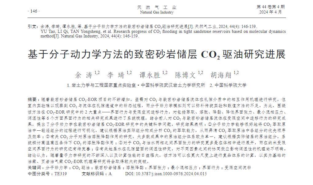 隨著致密砂巖儲層CO2-EOR項目的不斷增加,亟需對CO2與致密砂巖儲層流體在孔隙介質中的相互作用機理進行研究,但室內實驗難以觀察到CO2與流體在孔隙通道中的動態過程,而分子動力學模擬則可以彌補傳統實驗和數值方法的不足。為此,圍繞該方法在CO2-EOR研究中的2大重點——界面行為與受限空間運移行為,對包括萃取、溶脹、降黏、降低界面張力、最小混相壓力、潤濕性等6個方面界面行為的相關研究成果進行了系統梳理,結合前人對CO2與致密砂巖儲層流體在受限空間中運移行為的研究成果,提出了分子動力學在致密砂巖儲層CO2-EOR研究中的關鍵科學問題。