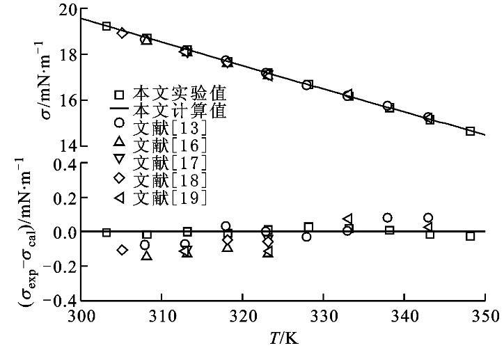 圖3正庚烷表面張力實驗值與擬合方程和文獻值的比較