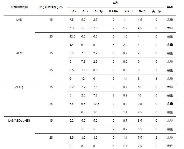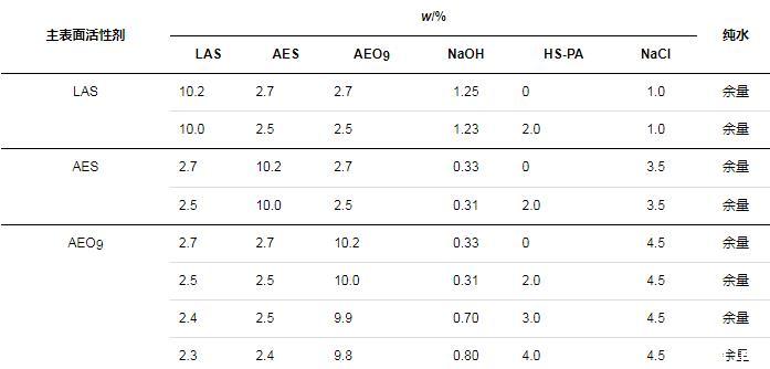 分別考察了在以LAS、AES和AEO9為主要表面活性劑的體系中,HS-PA作為改性聚丙烯酸/酯高分子表面活性劑可發(fā)揮的增稠以及去污效果。在配方設(shè)計(jì)上,總活性物質(zhì)量分?jǐn)?shù)約為15%。由于HS-PA的增稠作用需要和NaCl協(xié)同起效,而不同配方的耐鹽性不同,因此,根據(jù)空白組(無(wú)HS-PA)配方黏度不反稀的NaCl用量,來(lái)確定同組樣品(含HS-PA)的NaCl用量,具體配方如表1所示(表中LAS、AES已換算為純質(zhì)量分?jǐn)?shù),HS-PA(w=30%)未換算)。