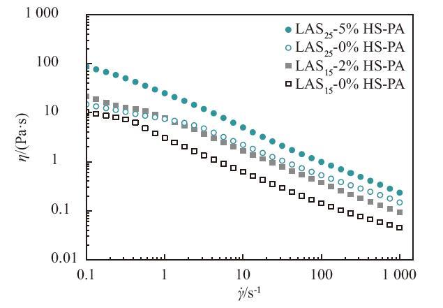 圖7為不同配方洗滌劑的表觀黏度隨剪切速率變化曲線,隨著剪切速率不斷增加,4個(gè)樣品的表觀黏度均逐漸減小,表現(xiàn)出剪切變稀的非牛頓流體行為。在恒定剪切速率下,體系中加入HS-PA將提高洗滌劑的黏度。結(jié)合偏光顯微鏡圖像可知,HS-PA的加入使得分子空間堆積構(gòu)型發(fā)生改變,體系中出現(xiàn)更多的球形層狀液晶,液晶結(jié)構(gòu)越多越完整,則說(shuō)明其形成的聚集體中,分子排布越緊密且越有序,層間發(fā)生滑動(dòng)時(shí)越困難,宏觀表現(xiàn)為黏度越大。當(dāng)無(wú)HS-PA影響時(shí),在相同剪切速率下,活性物質(zhì)量分?jǐn)?shù)越高,黏度越大。這可能是因?yàn)榛钚晕镔|(zhì)量分?jǐn)?shù)越大,表面活性劑分子之間作用力越強(qiáng),分子鏈發(fā)生相對(duì)運(yùn)動(dòng)時(shí)的阻礙效果越明顯,黏度則越大。