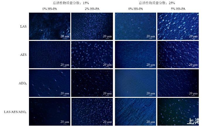 圖5為結(jié)構(gòu)型洗滌劑的偏光紋理圖(表2中的配方,以“主表面活性劑—總活性物質(zhì)量分?jǐn)?shù)—HS-PA質(zhì)量分?jǐn)?shù)”區(qū)分)。從圖中可以明顯看出,在分別以LAS、AES和AEO9為主表面活性劑的配方中,當(dāng)總活性物質(zhì)量分?jǐn)?shù)約為15%或者25%時(shí),加入HS-PA后,偏光圖像中的馬耳他十字液晶形狀均明顯增多。馬耳他十字是球形層狀液晶的典型織構(gòu),說(shuō)明了HS-PA的加入有利于體系形成球形層狀液晶。當(dāng)體系中不含HS-PA時(shí),偏光視野并非完全暗場(chǎng),而是有微弱的油狀條紋或者少量的馬耳他十字,表明其中也具有部分平面或者球形層狀液晶結(jié)構(gòu),但液晶較弱。不同主表面活性劑的層狀液晶結(jié)構(gòu)存在一些區(qū)別,AEO9為主表面活性劑的配方,其十字花紋理直徑為2~3μm,小于LAS、AES以及三元表面活性劑平衡體系的十字花紋理直徑(7~10μm)。以上結(jié)果與HS-PA復(fù)配體系中的粒徑分布變化相吻合:當(dāng)HS-PA與低分子量表面活性劑復(fù)配時(shí),LAS/AES與HS-PA的混合膠束粒徑明顯變大,但AEO9與HS-PA的混合膠束粒徑只略微變大。根據(jù)球形層狀液晶的結(jié)構(gòu)可知,其內(nèi)部混合膠束粒徑越大,則相應(yīng)的液晶粒徑越大。對(duì)于除AEO9外的其他3種體系而言,總活性物質(zhì)量分?jǐn)?shù)從15%提高到25%,HS-PA加量從2%增加至5%,球形層狀液晶的粒徑會(huì)相應(yīng)增大,此現(xiàn)象在LAS為主表面活性劑以及LAS較多的三元表面活性劑平衡體系中更為明顯。
