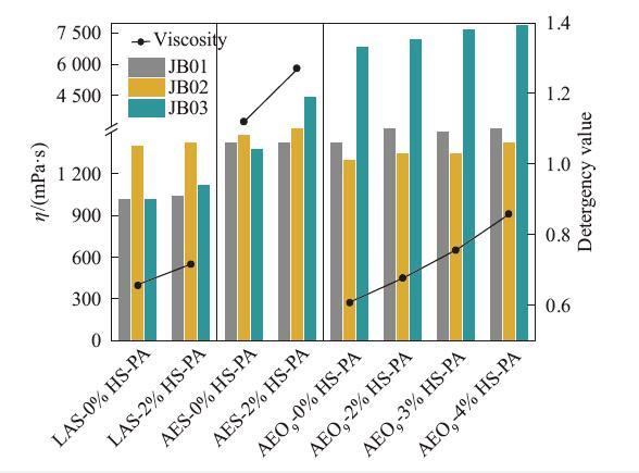 HS-PA作為高分子表面活性劑,不僅具有高分子的增稠性能,還有一定表面活性。為確保與空白組的總表面活性劑質(zhì)量分?jǐn)?shù)一致,在加入HS-PA的同時(shí),其他表面活性劑的添加量將相應(yīng)地減少(具體如表1所示)。表1中不同配方洗滌劑的去污力如圖4中的柱狀圖所示,不論有無(wú)HS-PA,不同表面活性劑體系的去污力有顯著區(qū)別:LAS為主表面活性劑的體系整體去污力最差,JB01炭黑和JB03皮脂污布的去污力未達(dá)到標(biāo)準(zhǔn)洗滌劑;其次為AES體系,在3種污布上的去污力均超過(guò)標(biāo)準(zhǔn)洗滌劑;AEO9的JB01和JB02去污力與AES體系接近,但它的皮脂去污力優(yōu)于AES體系。當(dāng)在不同體系的洗滌劑中復(fù)配HS-PA后,配方的JB01和JB02去污力無(wú)明顯變化,但JB03的去污效果均有提高,說(shuō)明了HS-PA有利于提高在皮脂污布上的去污力。這可能是由于高分子表面活性劑通常具有良好的乳化性能,其疏水鏈可深入疏水粒子,親水鏈進(jìn)入水溶液中,而它的高分子量具有較大空間位阻效應(yīng),使得分散狀態(tài)下的疏水粒子無(wú)法緊密相連,達(dá)到穩(wěn)定乳化的效果。皮脂作為油溶性污漬,經(jīng)過(guò)乳化后更易于被去除。從以上結(jié)果可知,在不同配方中加入HS-PA高分子表面活性劑不僅可以提高黏度,甚至還能提升在JB03上的去污力。