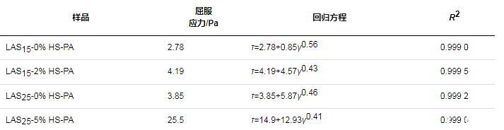 根據(jù)Herschel-Bulkley模型擬合的回歸方程及流變參數(shù)如表5所示(命名規(guī)則:主表面活性劑總活性物質(zhì)量分?jǐn)?shù)-HS-PA用量),其中擬合曲線相關(guān)系數(shù)(R2)均不小于0.999,相關(guān)性較高,表明LAS體系的流變性可以利用Herschel-Bulkley模型進(jìn)行研究。在活性物質(zhì)量分?jǐn)?shù)為15%的體系中添加2%HS-PA,屈服應(yīng)力從原先的2.78 Pa提高至4.19 Pa,在25%活性物配方中加入5%HS-PA,屈服應(yīng)力由3.85 Pa提高至25.5 Pa,說(shuō)明HS-PA的添加可以提高體系的屈服應(yīng)力。屈服應(yīng)力是指液晶結(jié)構(gòu)破壞時(shí)的臨界剪切應(yīng)力值。由前文研究結(jié)果可知,HS-PA的加入使配方獲得更多更致密的球形層狀液晶,因此,相應(yīng)地,體系屈服應(yīng)力也越大。而屈服應(yīng)力越大,當(dāng)體系中包含水不溶粒子(如微膠囊)時(shí)越容易穩(wěn)定,該結(jié)果與離心測(cè)試結(jié)果相契合。