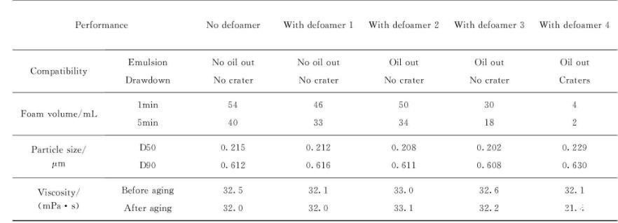 消泡劑的消泡能力與乳液的相容性成反比關系。消泡劑1和2與乳液的相容性最好,但因為部分溶解于乳液中,使消泡強度減弱;而消泡劑4與乳液的相容性最差,雖然具有極強的消泡性,但是因為過于疏水而難與乳液相容,所以容易造成表面缺陷。消泡劑3與乳液的相容性與消泡能力較為平衡,是最佳的消泡劑選擇。