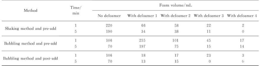 用鼓氣法研究了不同的消泡劑添加方式,由表1可以發(fā)現(xiàn)后添加方式比先添加方式的初始泡沫明顯降低。后添加方式的消泡劑大量聚集于泡沫表面,破壞了氣液界面的平衡。雖然在實際生產(chǎn)過程中以先添加方式為主,但試驗結果給出了制備工藝改進的思路。