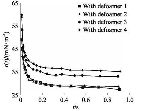 圖1是添加消泡劑后起泡液(0.2%二異辛基琥珀磺酸鈉鹽水溶液)的動態(tài)表面張力r(t)與時間t的關系圖。由圖1可以看出:在同樣的添加量下,分子級消泡劑(消泡劑1、2)可使起泡液具有更低的動態(tài)表面張力,這與其雙子結構有關;有機消泡劑(消泡劑3、4)在起泡物質(zhì)的協(xié)同作用下,也具有一定的降低起泡液動態(tài)表面張力的能力;在起泡液中,不論是加入分子級消泡劑還是有機消泡劑,在時間趨于1s時,其表面張力都低于36mN/m.