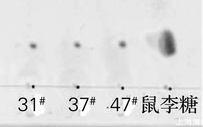 將菌株31#、37#和47#于30℃培養后,對發酵液萃取所得生物表面活性劑粗制品進行硅膠薄層層析,結果如圖4所示。將萃取所得生物表面活性劑粗制品進行酸解,硅膠薄層層析結果如圖5所示。