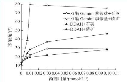 圖2雙酯Gemini季銨鹽、DDAH與石英和磷礦作用接觸角