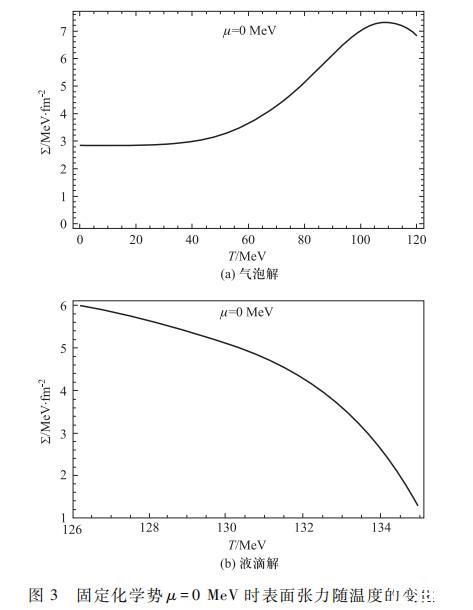 值得指出的是,對于液滴解,由圖1可以看出在更高溫度時,在σ=σv處的極小值將會消失,即偽真空消失。此時全空間將是均勻的夸克相,相變已經完成,液滴解也隨之消失,所以在更高溫度區域不存在液滴解。