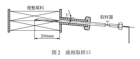 全塔共設(shè)有4個(gè)取樣口。1#取樣口設(shè)在塔頂回流處;2#取樣口設(shè)在距填料底部1200mm處;3#取樣口設(shè)在距填料底部400mm處;4#取樣口設(shè)在填料段以下。填料段的取樣口,即2#、3#取樣口的樣式如圖2所示。取樣器沿水平方向向上傾斜3°放置,伸入填料段的部分為半圓管,長度為200mm,直徑為10mm。這樣設(shè)計(jì)以保證液相樣品順利地由填料中取出,且取出的液相樣品具有代表性。