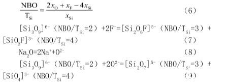 熔體表面張力與熔渣結(jié)構(gòu)的聚合程度密切相關(guān)。連鑄結(jié)晶器保護渣屬于硅酸鹽,硅酸鹽熔體中含有不同聚合程度的硅氧陰離子團。熔渣結(jié)構(gòu)的聚合程度用符號“NBO/TSi”表示,其計算公式如式(4)所示。NBO/TSi值越小,說明熔體聚合程度越高。將預(yù)熔渣和靜滴法測定后的渣樣成分分別帶入到式(6)中,計算結(jié)果如表2所示。從表中可以看出,靜滴法測定后渣樣的NBO/TSi值小于預(yù)熔渣的NBO/TSi值,說明靜滴法測定后的渣樣熔體結(jié)構(gòu)聚合程度高于預(yù)熔渣熔體結(jié)構(gòu)聚合程度。這是由于F-能降低熔渣結(jié)構(gòu)的聚合程度,將高聚合程度的硅氧陰離子團逐漸解聚成低聚合程度的硅氧陰離子,同時Na2O電解出O2-,O2-的出現(xiàn)亦可降低熔體的聚合程度,反應(yīng)式見(7)~(9):