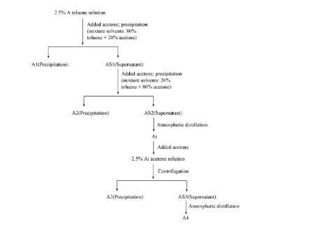 1.2.1瀝青質(zhì)及其亞組分的分離利用正己烷沉淀出原油中的瀝青質(zhì)A.利用混合溶劑(甲苯和丙酮)沉淀法,將A分為4個(gè)不同的亞組分,分離流程如Scheme 1所示。首先,制備質(zhì)量分?jǐn)?shù)為2.5%的A甲苯溶液,作為初始瀝青質(zhì)溶液,然后加入丙酮,將該混合物(甲苯/瀝青質(zhì)/丙酮)靜置20 h后,以3500 r/min的轉(zhuǎn)速離心40 min,分別收集瀝青質(zhì)的第1個(gè)亞組分A1和上清液AS1.在AS1中繼續(xù)加入丙酮至濃度為80%,離心沉淀,分別收集瀝青質(zhì)的第2個(gè)亞組分A2和上清液AS2.通過常壓蒸餾去除AS2中的溶劑,得到瀝青質(zhì)的中間亞組分Ai.將Ai以質(zhì)量分?jǐn)?shù)為2.5%的濃度溶于丙酮,靜置20 h后,離心40 min得到瀝青質(zhì)的第3個(gè)亞組分A3和上清液AS3,然后通過常壓蒸餾去除AS3中的溶劑得到瀝青質(zhì)的第4個(gè)亞組分A4.