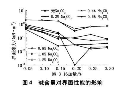 三元復合驅中注入堿能引起地層黏土分散、運移,導致地層滲透率下降,堿與油層流體及巖石礦物反應,可形成堿垢,對地層造成傷害,會引起油井結垢,影響油井正常生產;加入堿能大幅降低聚合物的黏彈性。因此,堿對DW-3-16表面活性劑性能的影響至關重要。