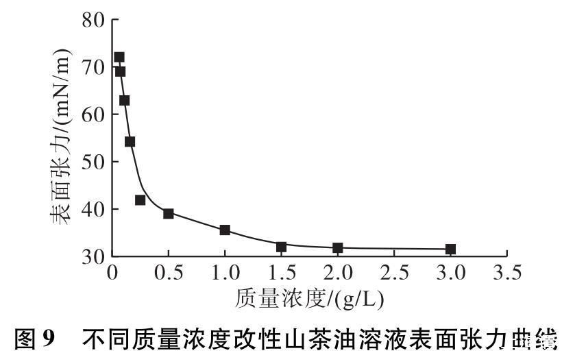 對(duì)不同質(zhì)量濃度的改性山茶油溶液進(jìn)行表面張力測(cè)試,結(jié)果如圖9所示。