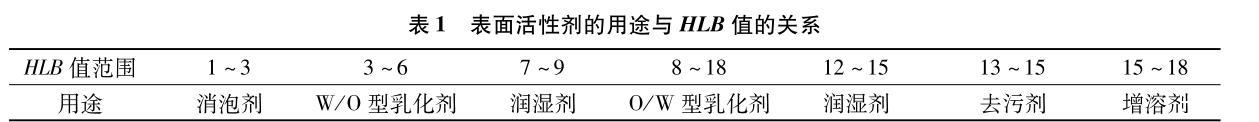 HLB值可用來(lái)衡量表面活性劑的親水親油性的大小,HLB值越大代表親水性越強(qiáng),HLB值越小代表親油性越強(qiáng),HLB值的轉(zhuǎn)折點(diǎn)為10,HLB值大于10一般為親水性,HLB值小于10為親油性,人們一般以HLB值為標(biāo)準(zhǔn)指導(dǎo)表面活性劑的實(shí)際應(yīng)用(見(jiàn)表1)。