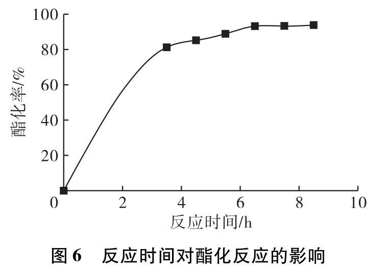 由圖6可知,隨著反應(yīng)時(shí)間的延長(zhǎng),反應(yīng)速率逐漸減慢,酯化率不斷增加,當(dāng)反應(yīng)時(shí)間為6.5 h之后反應(yīng)逐漸趨于平衡,繼續(xù)延長(zhǎng)反應(yīng)時(shí)間對(duì)酯化率并沒(méi)有很大的影響。繼續(xù)延長(zhǎng)反應(yīng)時(shí)間不僅會(huì)增加產(chǎn)物被氧化的風(fēng)險(xiǎn),而且還會(huì)造成資源浪費(fèi)。綜合考慮,選擇反應(yīng)時(shí)間為6.5 h。