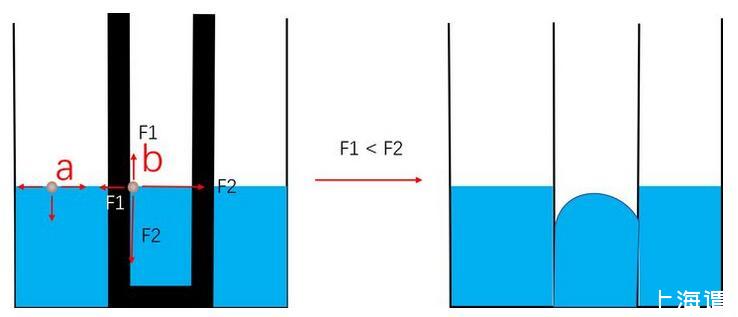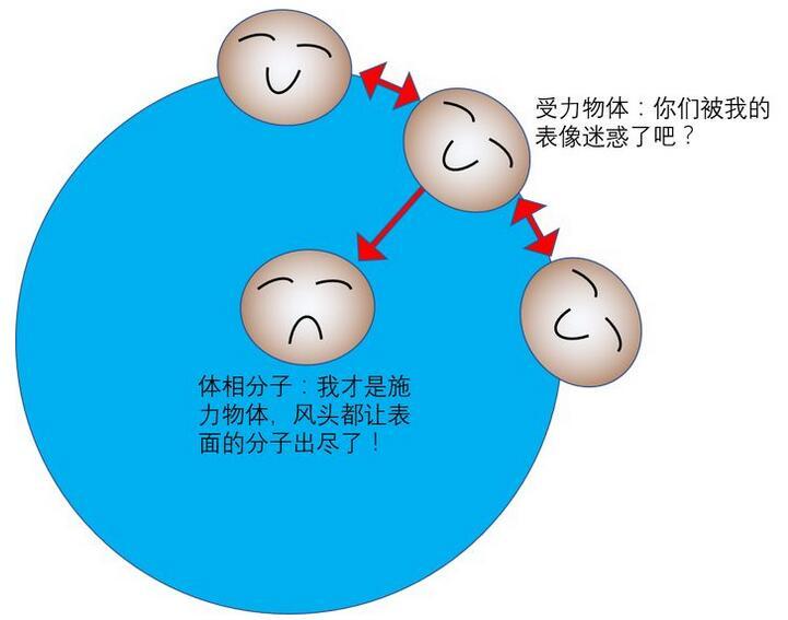 自由界面處的水分子只受到水分子的作用,如a處所示。而對于b處界面分子。其左側(cè)的分子被固體分子替代,這個替代產(chǎn)生了固液分子作用力(F1)與液液分子作用(F2)的差別,這個差別使液面運動。