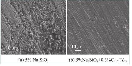 為研究兩親性碳點在硅酸鈉溶液中的摩擦學性能,利用SGW-10G型杠桿四球摩擦試驗機測試,測試方法參照行業標準SH/T 0189—92《潤滑油抗摩損性能測定法(四球機法)》,實驗參數設置如下,用掃描電鏡(SEM)拍攝摩擦表面形態圖片并分析如圖7所示。