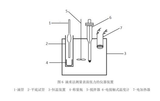 滴重法是利用液滴重量與支持它的表面張力的力相平衡進(jìn)行測定的試驗(yàn)。主要也是因?yàn)楸砻鎻埩εc液滴重量、滴管半徑、液體密度及重力加速度相關(guān)。滴重法要使用到的儀器主要玻璃滴管、恒溫裝置、平底試管、稱量瓶、攪拌器、電接觸式溫度計(jì)、電加熱器等。試驗(yàn)步驟也是先配置測定溶液,清洗測量儀器,然后安裝好實(shí)驗(yàn)裝置,啟動攪拌器,調(diào)節(jié)接觸溫度計(jì),至所需溫度,使水恒溫半小時,要求普通溫度計(jì)的誤差不超過±0.5 ℃。恒溫足夠時間以消除平底試管內(nèi)與水溫的差,一般溫差小于 1 ℃。用分析天平稱得潔凈干燥的稱量瓶空瓶重。放入浸入恒溫裝置的平底試管內(nèi)。將橡皮管套于移液管的未加工端,用吸球?qū)⒋郎y液吸入移液管內(nèi),用夾子夾住橡皮管不使待測液滴下然后將移液管垂直懸掛入恒溫裝置內(nèi)的試管中,但不可與稱量瓶接觸。恒溫半小時后,慢慢旋開夾子,讓液體自然滴下,調(diào)節(jié)水滴的下落速度至每滴 100-120 s。至20 滴時擰緊夾子,取出移液管。將稱量瓶稱重,減去空的稱量瓶重量,求得每液滴的重量。在同一溫度下重復(fù)兩次。對于表面張力能隨時間迅速變化的或者界面能夠迅速相互飽和的界面,測定精度為±0.1%。